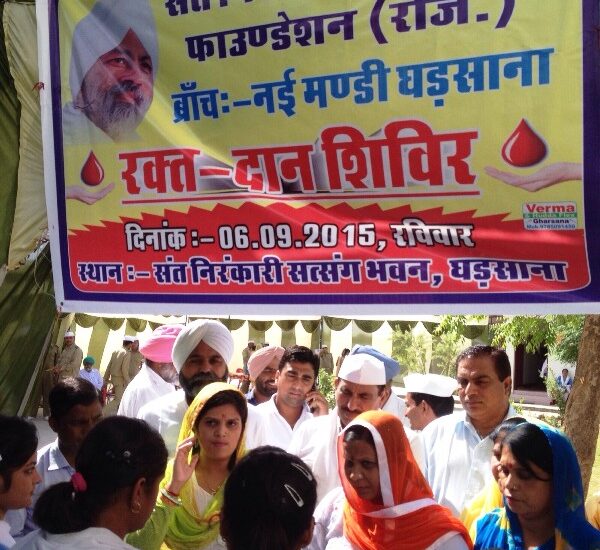 On September 6, 2015, a blood donation camp was organized in the Sant Nirankari Satsang Bhawan, Gharsana in Rajasthan where 176 units of blood were donated by devotees of the Sant Nirankari Mission. They included 21 women.